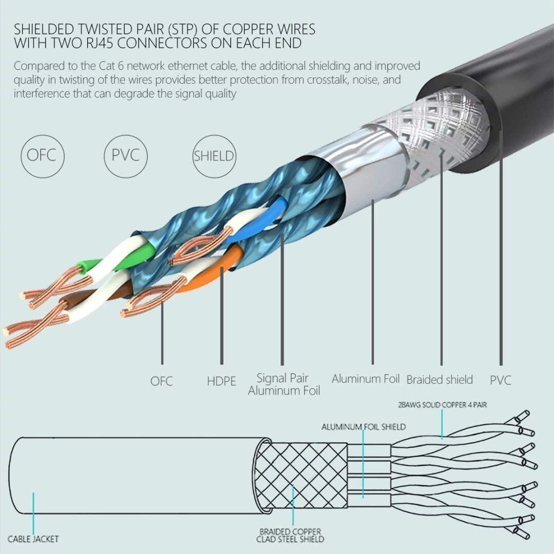 Compared to the Cat 6 network Ethernet cable, the additional shielding and improved quality in twisting of the wires provides better protection from crosstalk, noise, and interference that can degrade the signal quality.