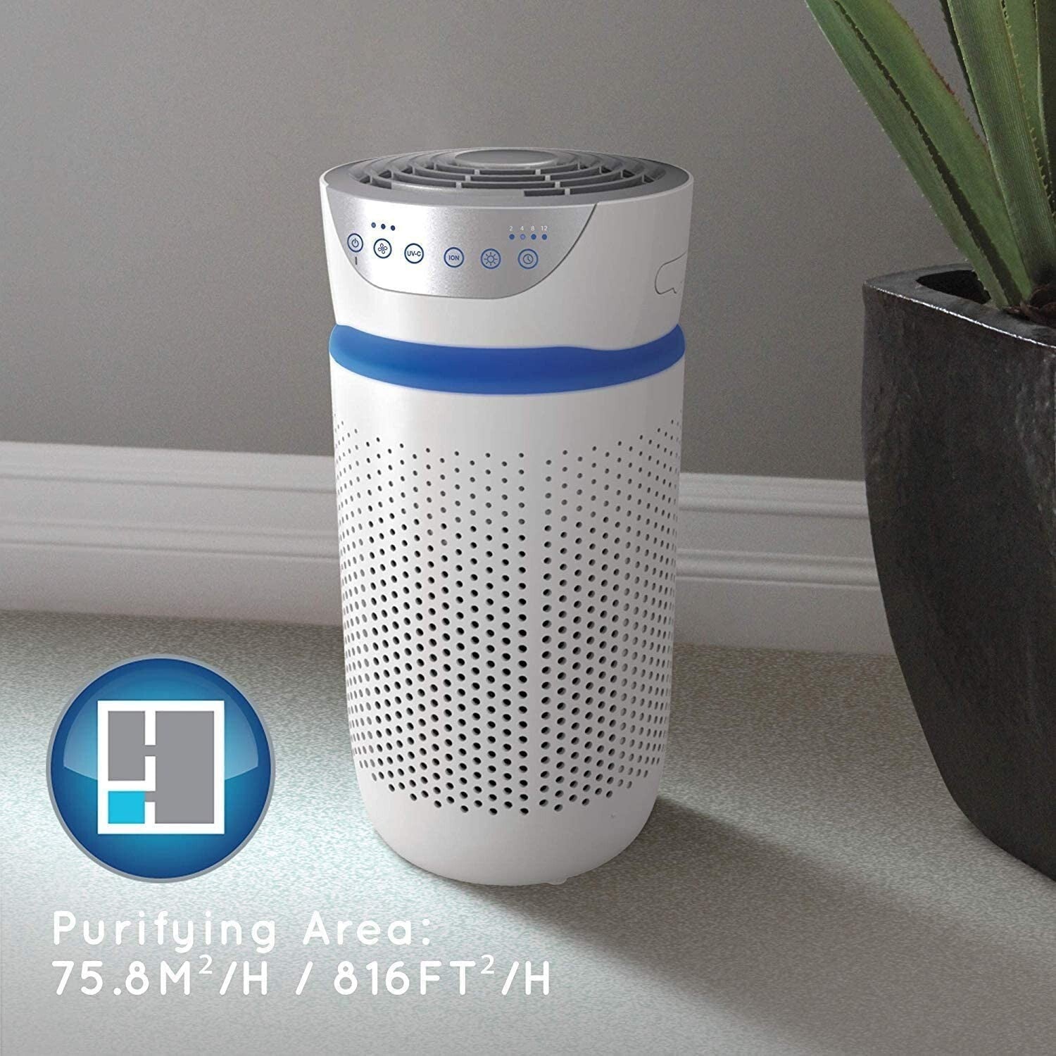 Designed for areas up to 75.8 m² (816 ft²), this purifier provides 4.8 air changes per hour – ideal for bedrooms, offices, nurseries, or other smaller spaces.
