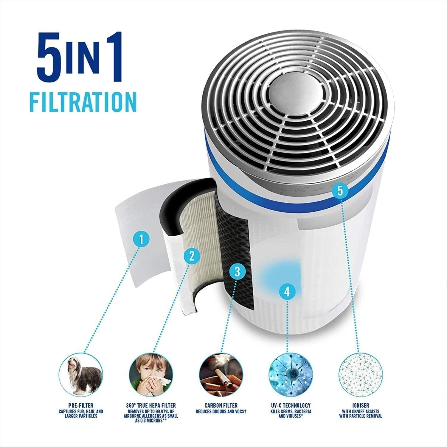 HoMedics 5-in-1 Air Purifier HEPA Filtration, Catch Germs, Dust, Pollen & Smoke