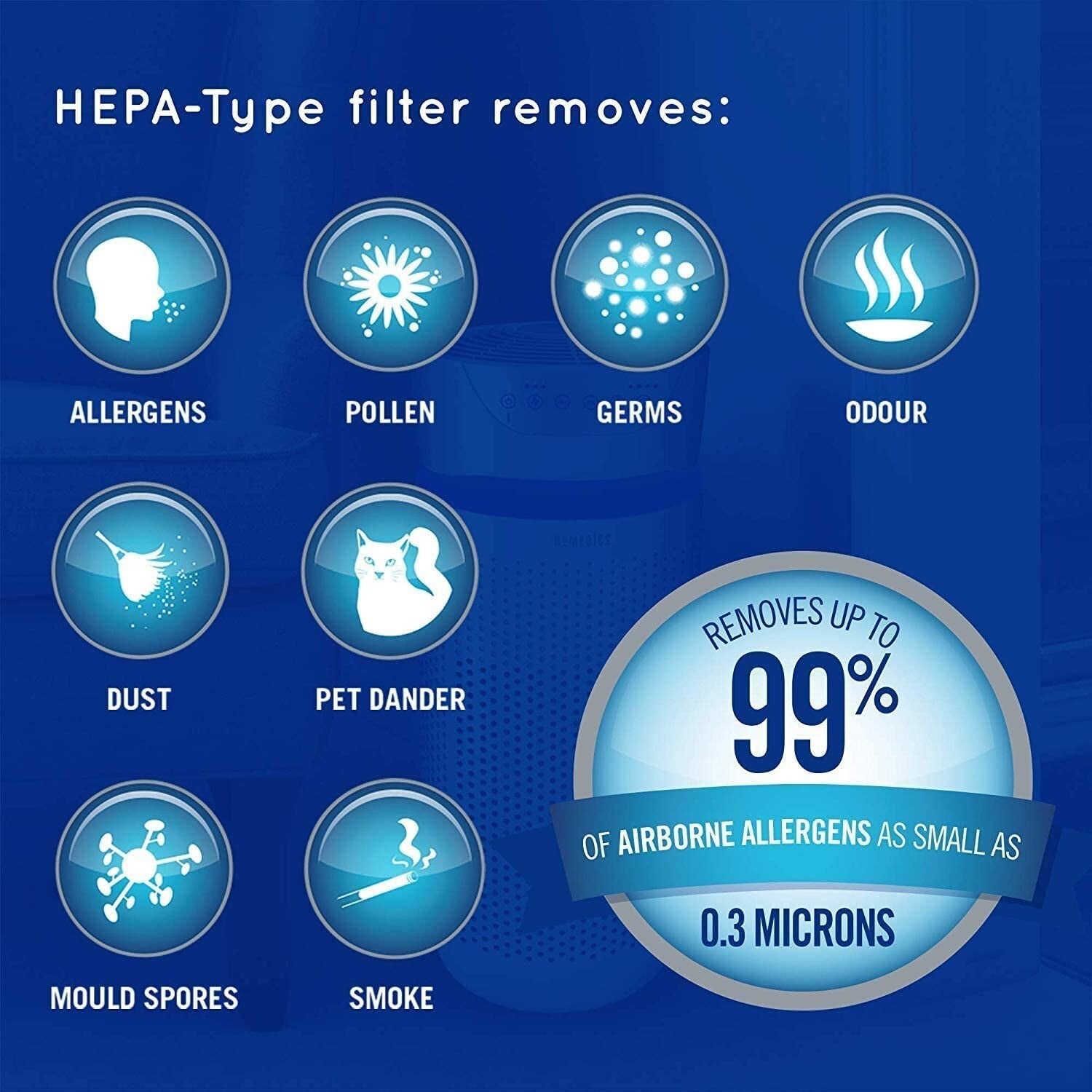 The high-performance HEPA-type filter captures up to 99% of airborne allergens and particles as small as 0.3 microns – including dust, pollen, smoke, pet dander, mould spores, and germs.