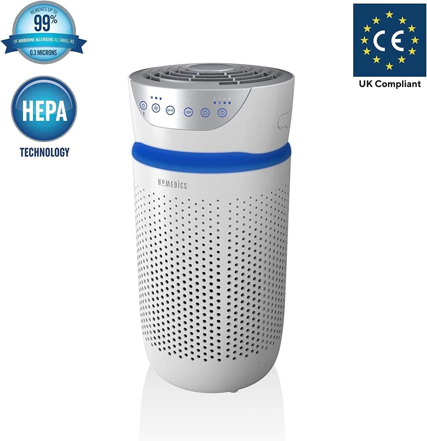Breathe cleaner, healthier air with the HoMedics HEPA Air Purifier, designed to effectively eliminate airborne contaminants, reduce odours, and improve overall air quality in your home. Perfect for small spaces, it combines powerful UV-C sterilisation with multi-stage filtration for round-the-clock protection.