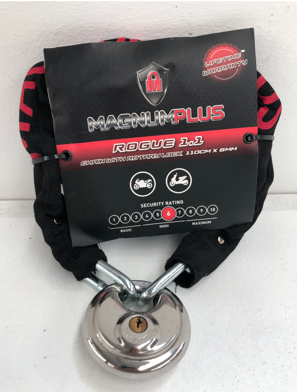 The MagnumPlus Rogue Chain 1.1m x 8mm with Rotary Lock offers motorized bike and scooter owners the highest level of security for use in high crime areas. The 8mm hardened steel square links resist damage from hacksaws and bolt cutters.