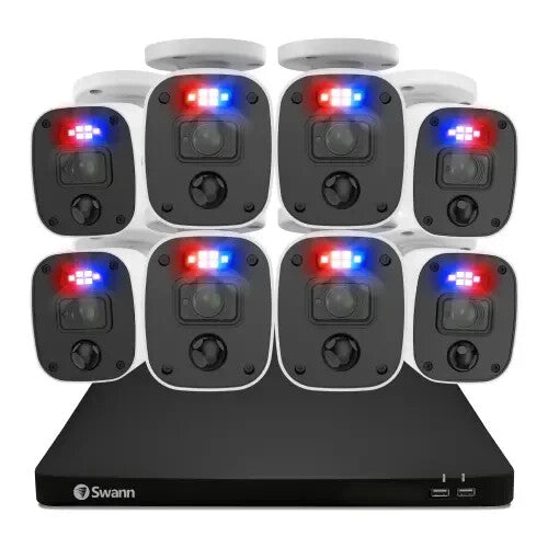 Featuring SwannForce controllable red and blue flashing lights and spotlights, this DVR stops criminals in their tracks. See clear detail with 1080p Full HD video with audio, and watch live on your phone or TV. With color night vision, heat and motion detection in weatherproof bullet cameras, it's the ultimate security solution. It’s security made smarter - and fee free.